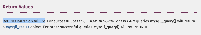 실패했을 때 'FALSE'를 리턴값으로 반환한다. SELECT, SHOW, DISCRIBE와 같이 정보를 읽는 것과 관련된 쿼리를 실행했을 때는 mysqli_result 라는 객체를 반환한다.