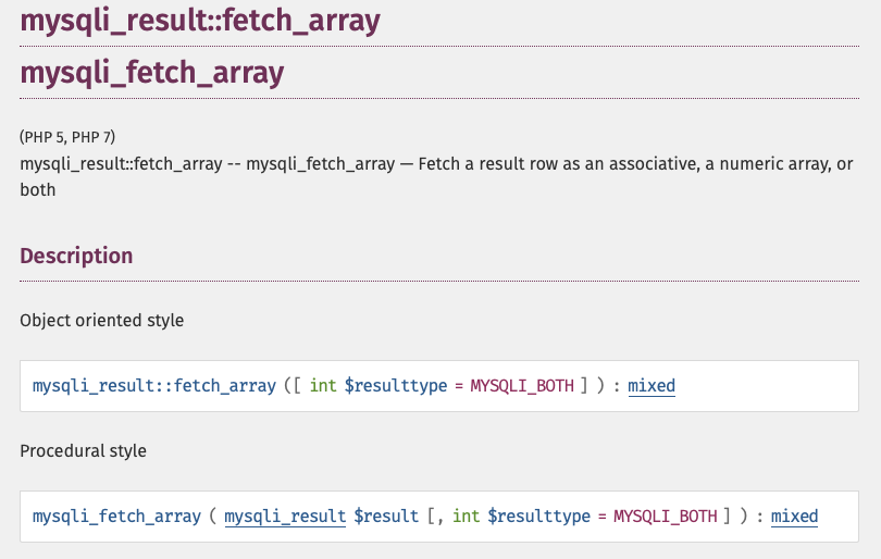 데이터베이스와 PHP는 서로 완전히 다른 기술이기 떄문에 , PHP라는 컴퓨터 언어를 통해서 그 데이터를 활용하기 위해서는 PHP 데이터 타입으로 전환하는 과정을 거져야 된다. mysqli_fetch_xxx 이름의 API 들이 그러한 역할을 한다. ( *fetch : 가져오다. )