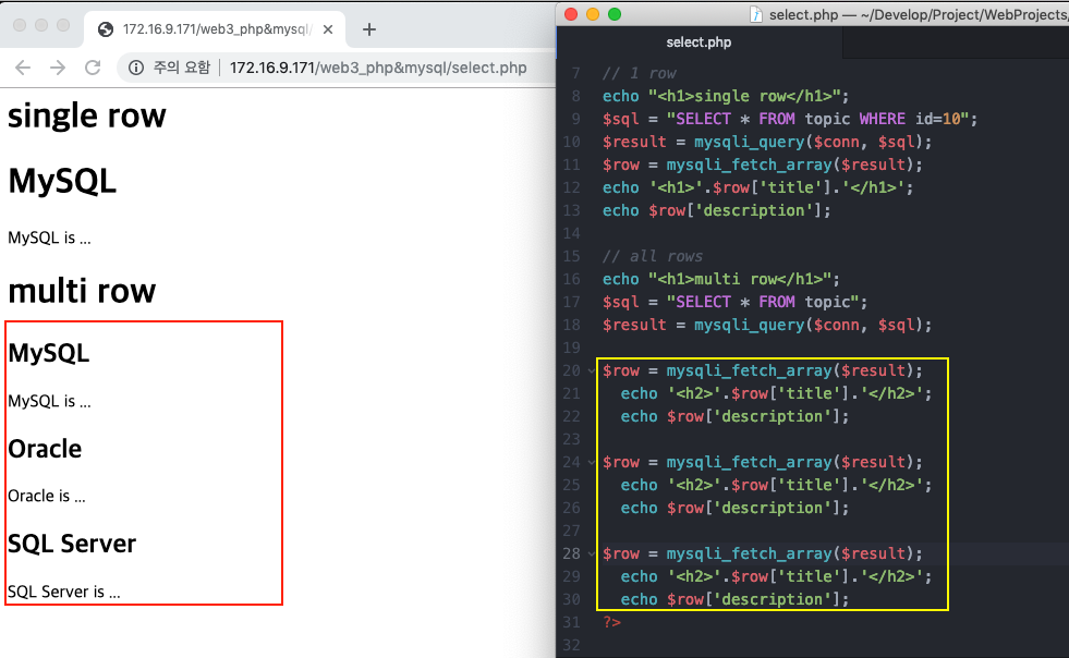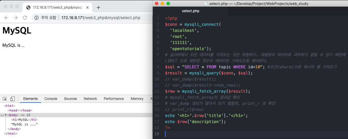 $sql = "SELECT * FROM topic WHERE id=10"; #조건(where)으로 하나의 행 가져오기