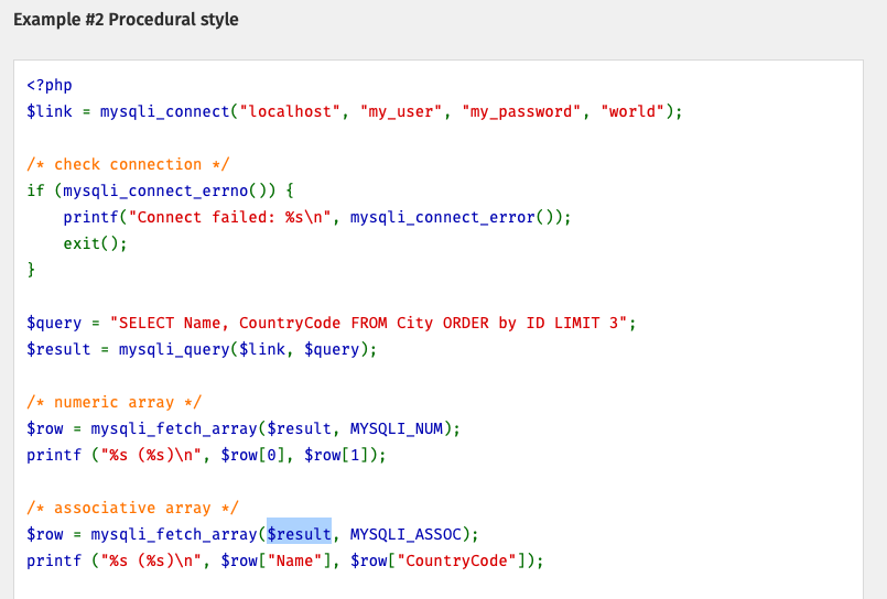 첫번째 인자로 mysqli_result 가 온다. 예제를 통해서 확인
