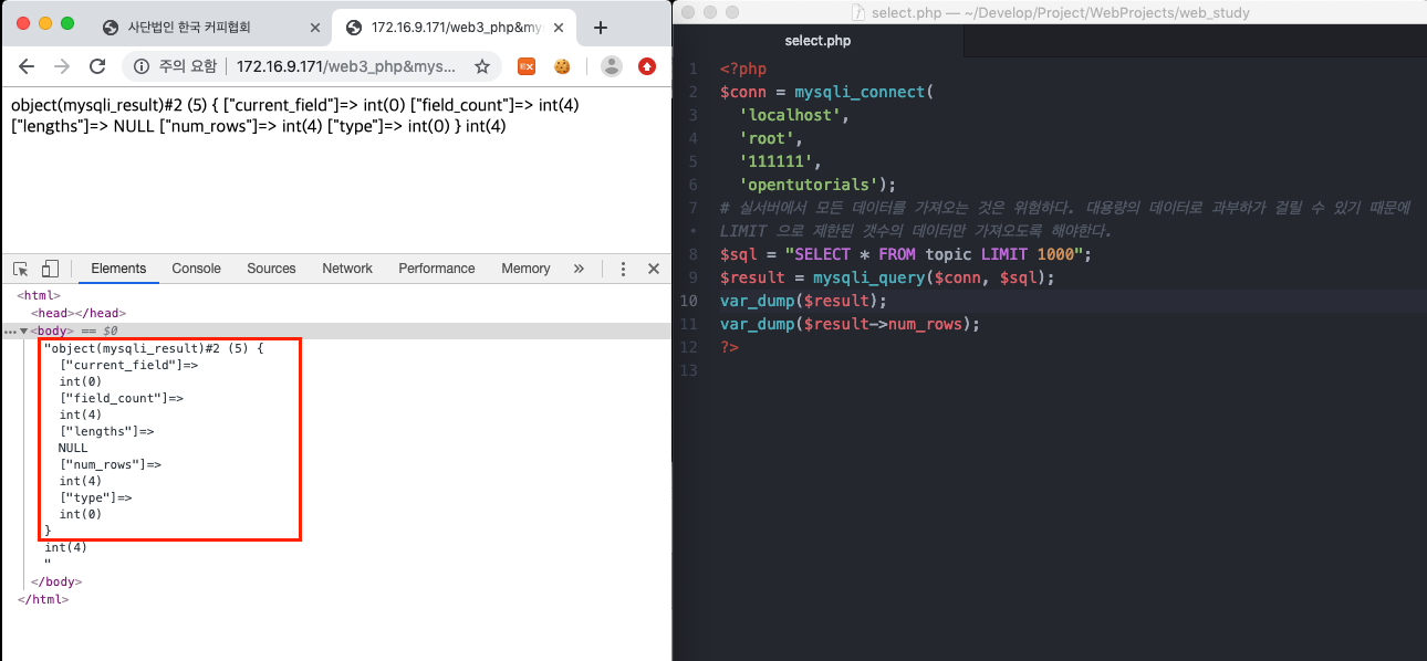 'mysqli_result' 라고 하는 객체를 반환하고 있고, 객체에는 num_rows : 행의 갯수, field_count : 컬럼의 갯수 들이 담겨 있다.