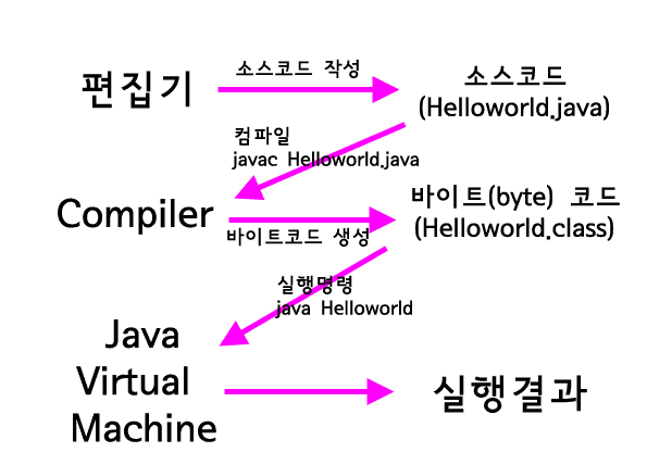 그런데 코드 자체를 바로 실행할 수는 없다. 자바의 문법은 사람만이 이해할 수 있는 형식으로 되어 있기 때문이다. 이 코드를 컴퓨터가 이해할 수 있는 상태로 변환해주는 과정이 필요한데 이것을 컴파일(compile)이라고 하고, 이 작업을 하는 소프트웨어를 컴파일러(compiler)라고 부른다. 자바의 컴파일러는 javac 라는 이름을 가지고 있다. 만약 helloworld.java라는 코드를 컴파일한다면 아래와 같은 식으로 javac를 실행하면 된다.