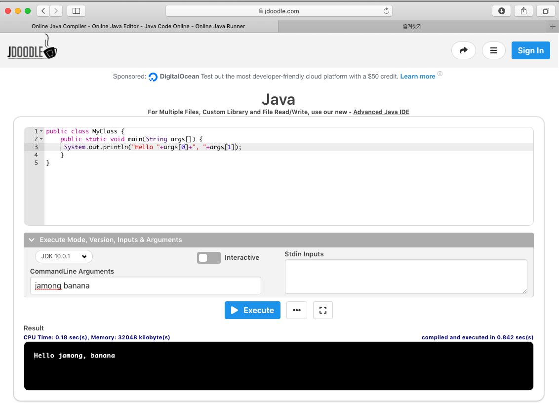 그 중, https://jdoodle.com 도구를 이용해서 실습하겠다.