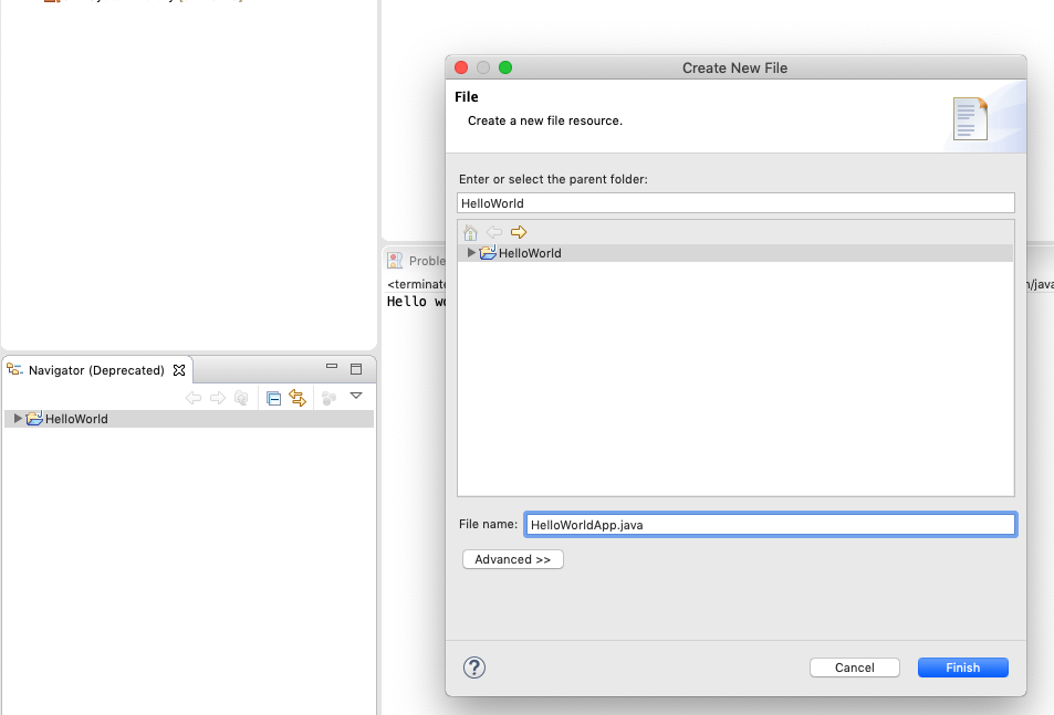 Finish를 누르면, ~JavaProjects/eclipse-workspace (워크스페이스) 디렉토리 하위의 HelloWorld 프로젝트 폴더가 생성된다.