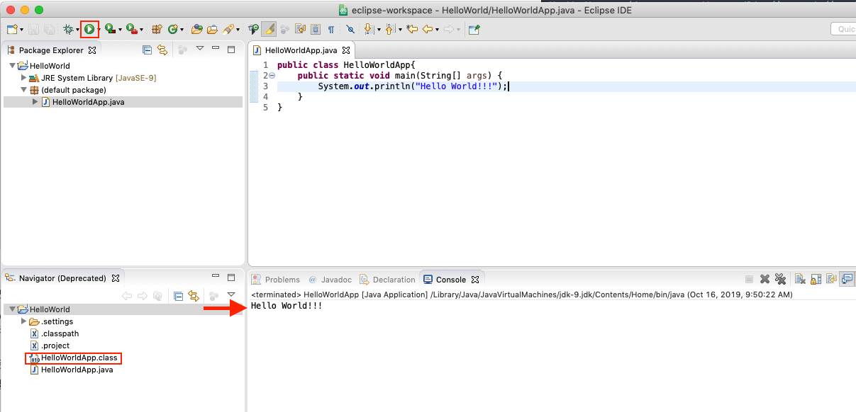 ( Package Explorer 에서는 class 확장자 파일은 숨김처리돼서 보여지지 않는다. ) - '실행'하면 Console 창에 'Hello World!!!' 가 출력된다.