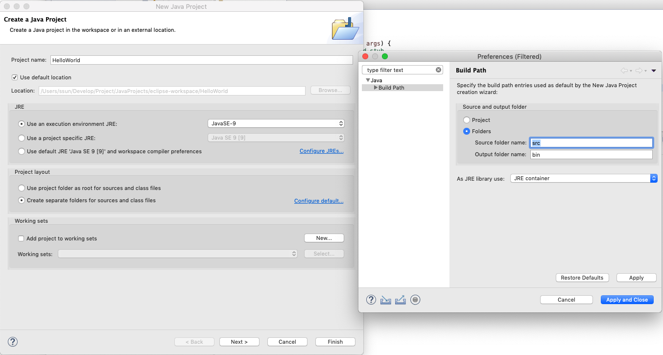 - 'Create separate folders for sources and class files' : 소스코드와 (컴파일된 실행파일인) class 파일을 다른 곳에 두겠다.
