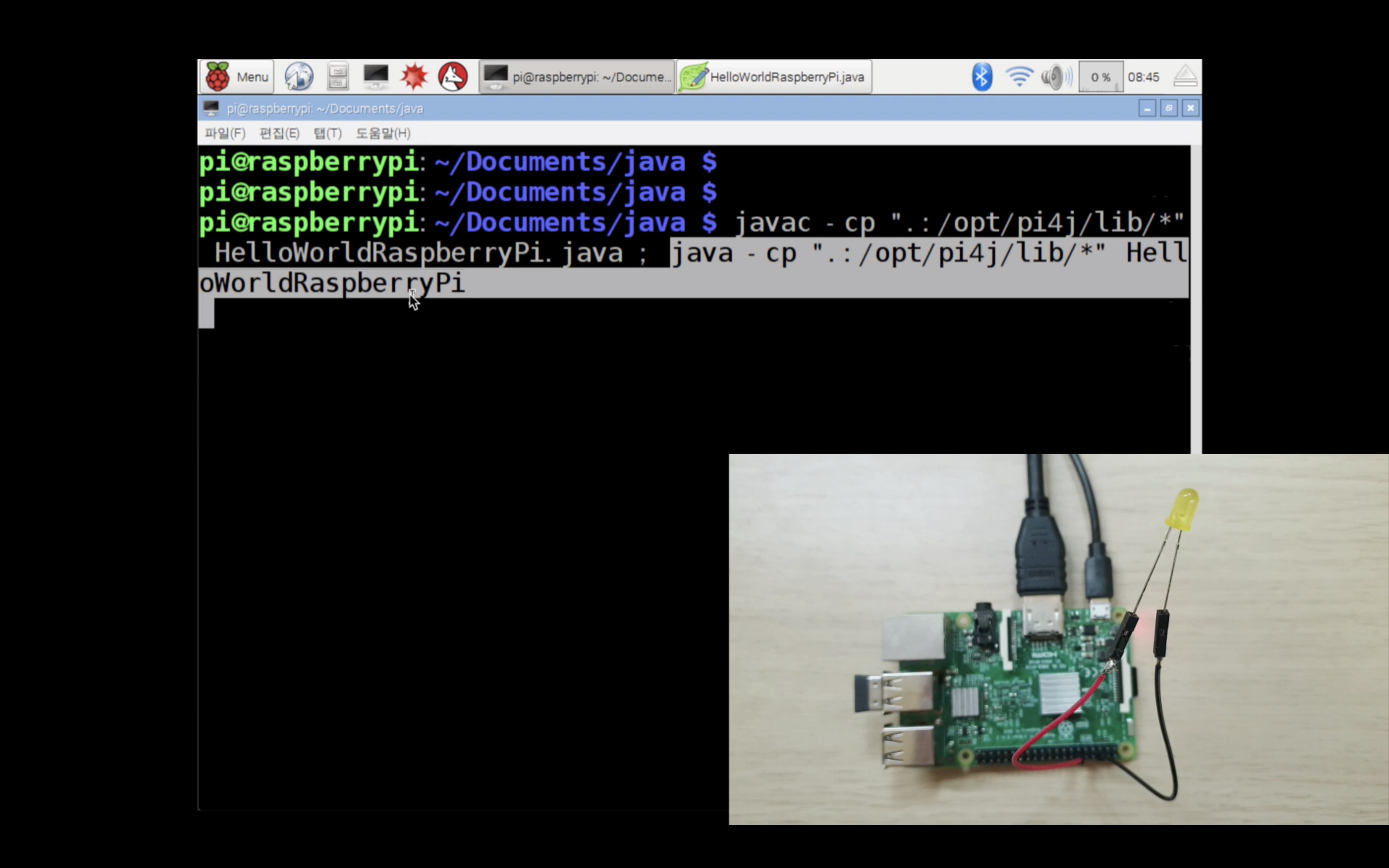 라즈베리파이라는 컴퓨터 안에 HelloWorldRaspberryPi.java 라는 파일을 만든 뒤 코드를 작성한다.