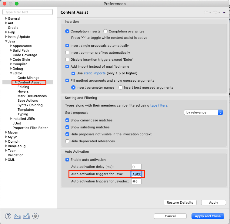'Auto activation triggers for Java' 의 값을 'ABCDEFGHIJKLMNOPQRSTUVWXYZabcdefghijklmnopqrstuvwxyz.'로 변경