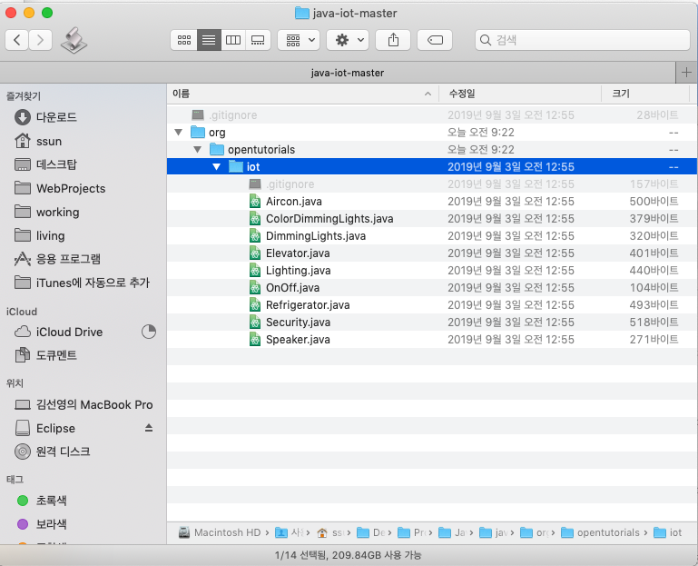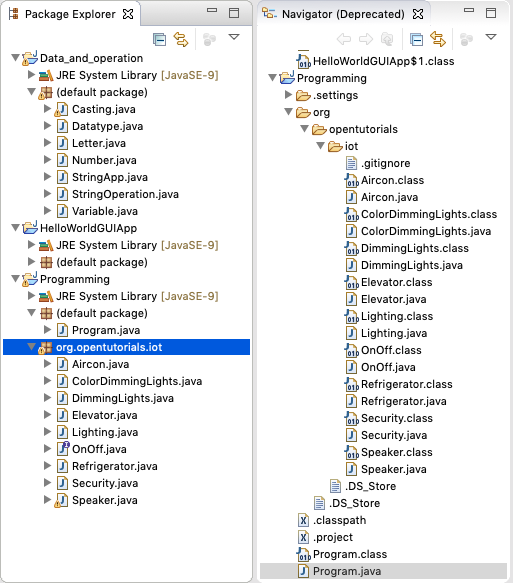 [Navigator] 에서 Programming 이라는 프로젝트에 org-opentutorials-iot 자바 파일들이 잘 이동된 것을 볼 수 있다.