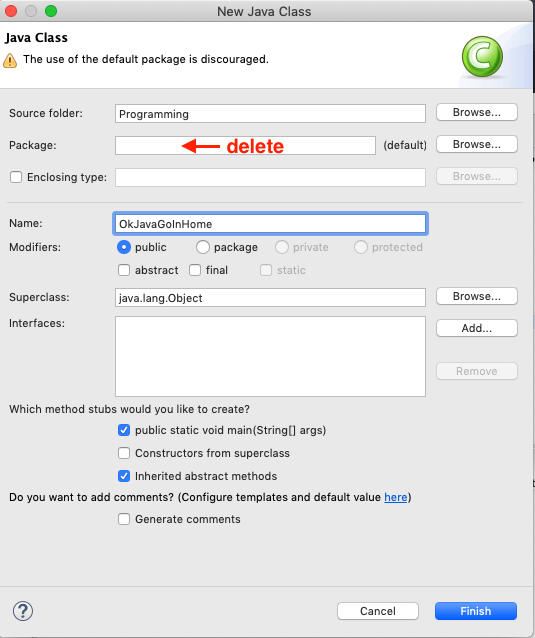 새 클래스 생성. Package에 내용이 들어가 있다면 지워줘서 default 값이 되도록 만들고 Finish