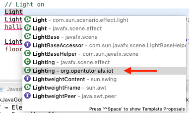 Light 클래스명을 쓰고 tab( 또는 ctrl + space )를 입력하면 Light라는 이름의 부품들을 보여준다. 그중에 우리가 쓰려고 하는 org.opentutorials.iot 패키지에 있는 Lighting 이라는 클래스를 더블클릭(enter)하면 자동으로 완성해주고 import 까지 자동으로 해준다.