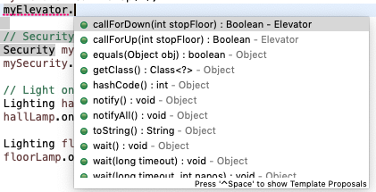 myElevator 입력 후, 점(.)을 입력하면 할 수 있는 명령들 목록이 보여진다. ()로 끝나는 명령들을 "Method(메소드)"라고 한다.