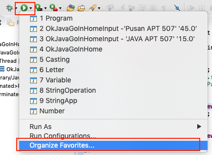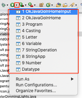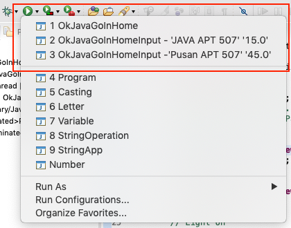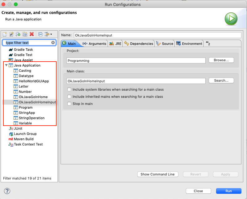 현재 창의 [Main] 탭의 의미 - " Programming 프로젝트의 Main class인 OkJavaGoInHomeInput 를 실행한다."