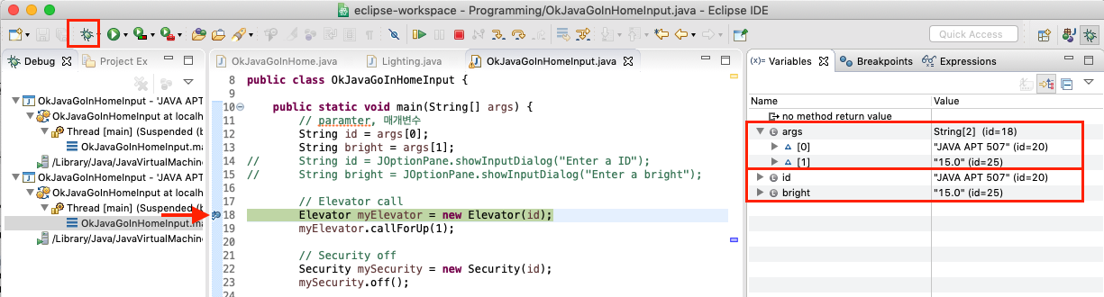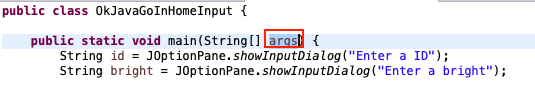 args[0] : JAVA APT 507 , args[1] : 15.0 가 들어가 있고, 그 값들이 각각 id와 bright 변수에 세팅되었다.