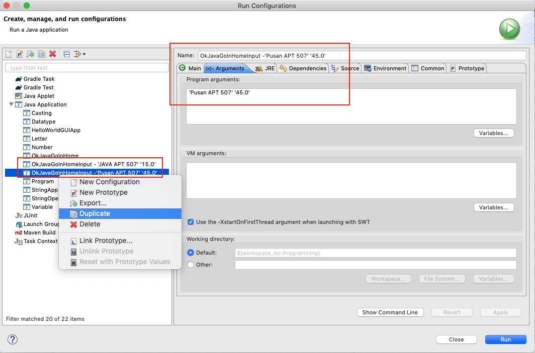 이런 식으로 여러가지 입력값으로 실행을 해보려면, [Run Configurations] 에서 프로젝트를 Duplicate(복제) 하여 [Argument]에서 입력값만 수정해서 실행하면 된다.
