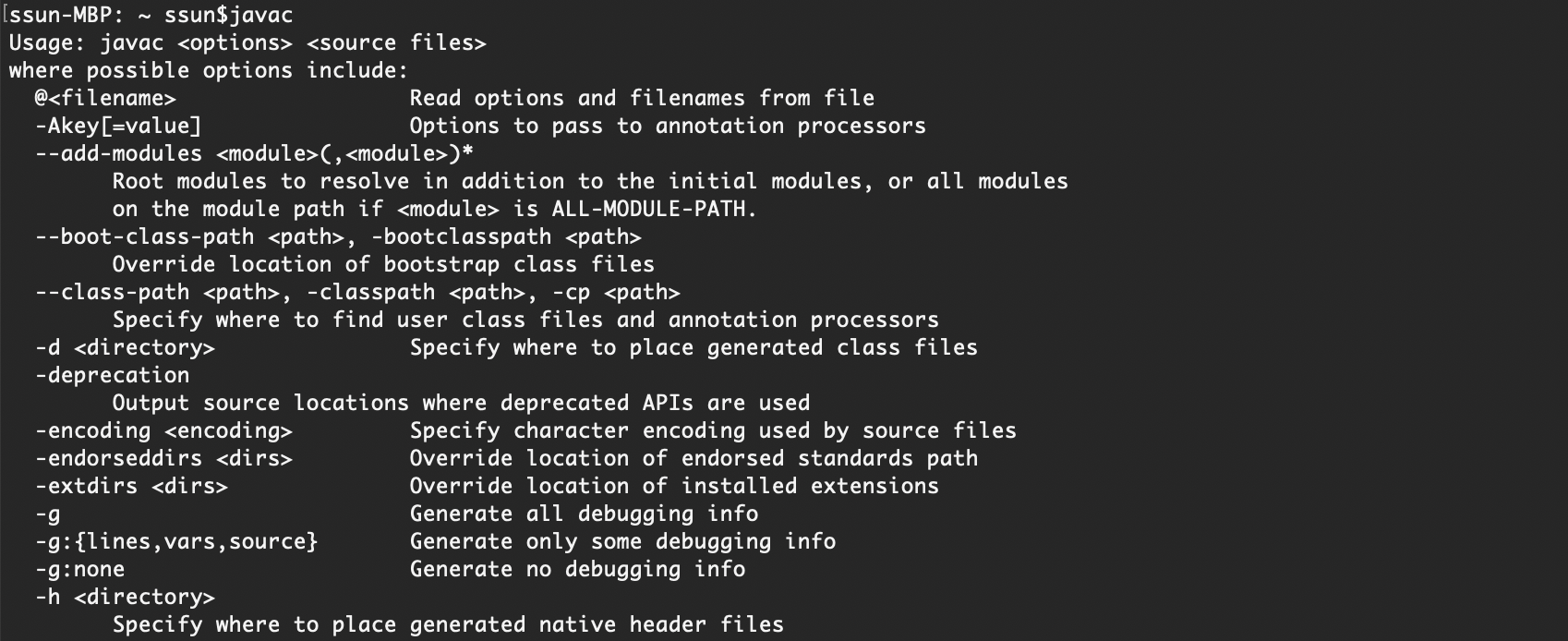 'javac'를 통해서 컴파일을 한다. 터미널에 'javac'를 입력하면 사용법을 볼 수 있다.
