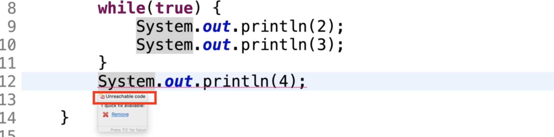 ※ Unreachable code : 실행될 수 없는 (닿을 수 없는) 코드. 앞의 코드가 무한루프로 끝나지 않아서 실행될 수 없다.