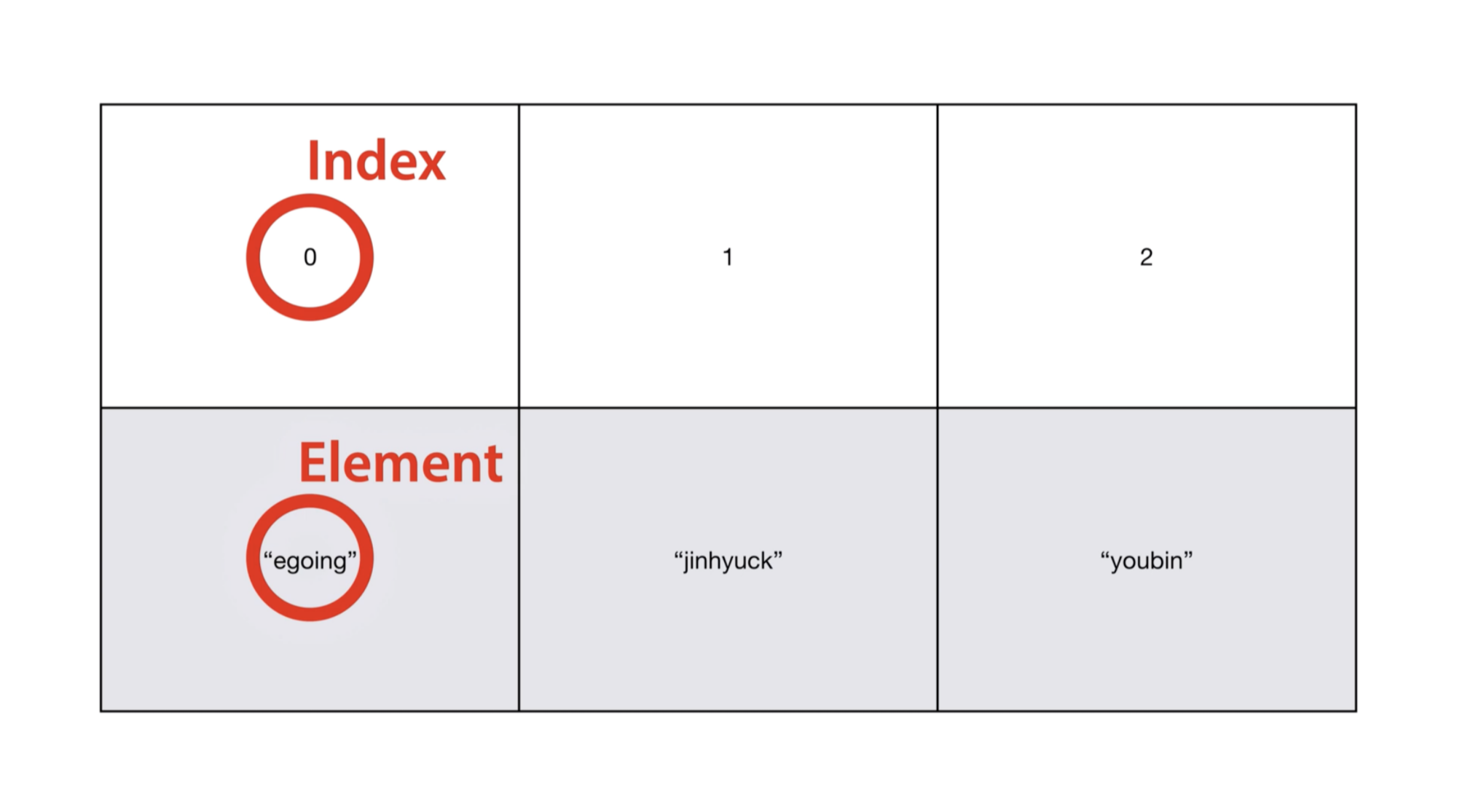 - Element(원소) : 각 배열 인덱스에 들어간 값