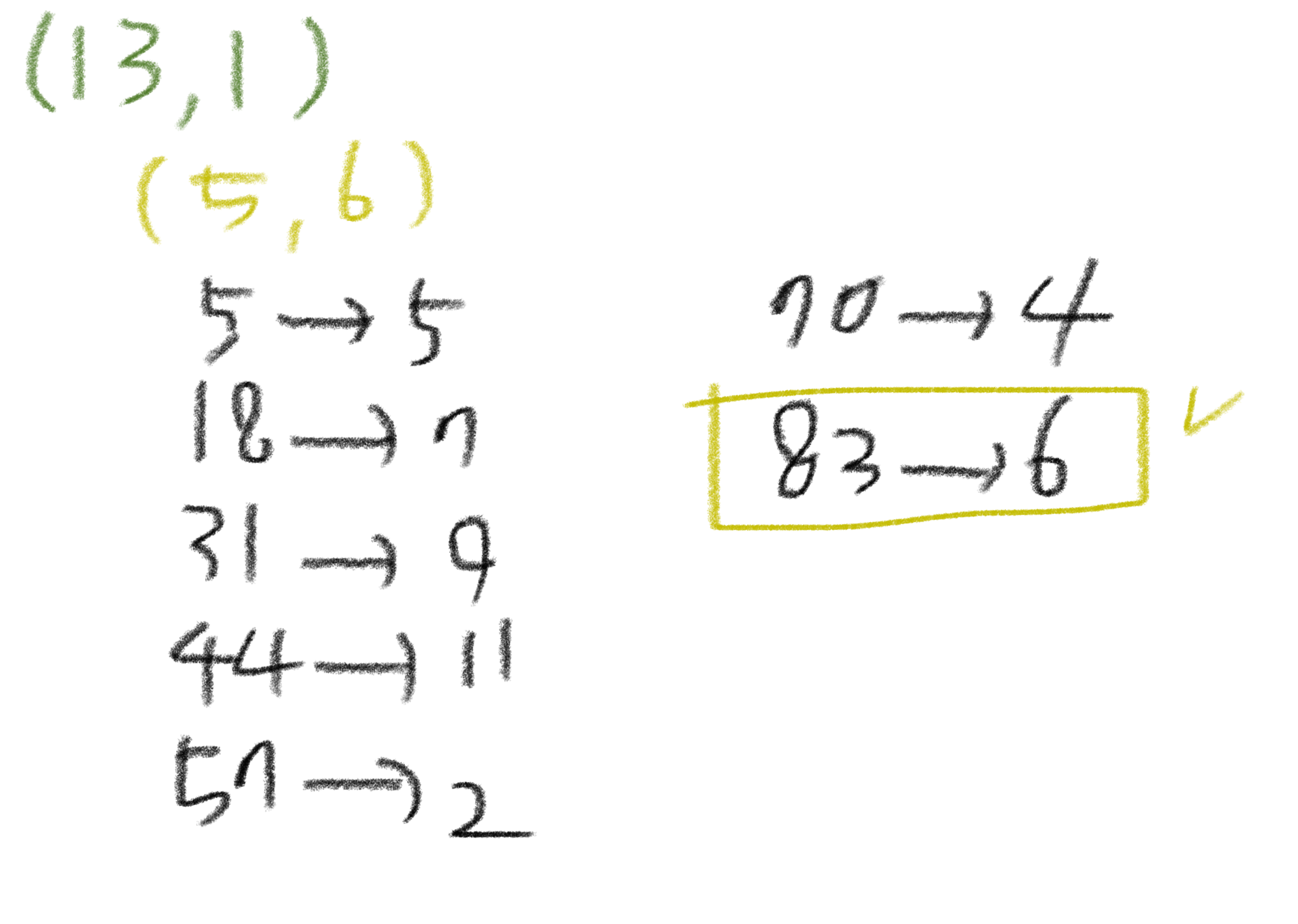 최근에 ICPC 탐사대는 남아메리카의 잉카 제국이 놀라운 문명을 지닌 카잉 제국을 토대로 하여 세워졌다는 사실을 발견했다. 카잉 제국의 백성들은 특이한 달력을 사용한 것으로 알려져 있다. 그들은 M과 N보다 작거나 같은 두 개의 자연수 x, y를 가지고 각 년도를 <x:y>와 같은 형식으로 표현하였다. 그들은 이 세상의 시초에 해당하는 첫 번째 해를 <1:1>로 표현하고, 두 번째 해를 <2:2>로 표현하였다. <x:y>의 다음 해를 표현한 것을 <x':y'>이라고 하자. 만일 x < M 이면 x' = x + 1이고, 그렇지 않으면 x' = 1이다. 같은 방식으로 만일 y < N이면 y' = y + 1이고, 그렇지 않으면 y' = 1이다. <M:N>은 그들 달력의 마지막 해로서, 이 해에 세상의 종말이 도래한다는 예언이 전해 온다.