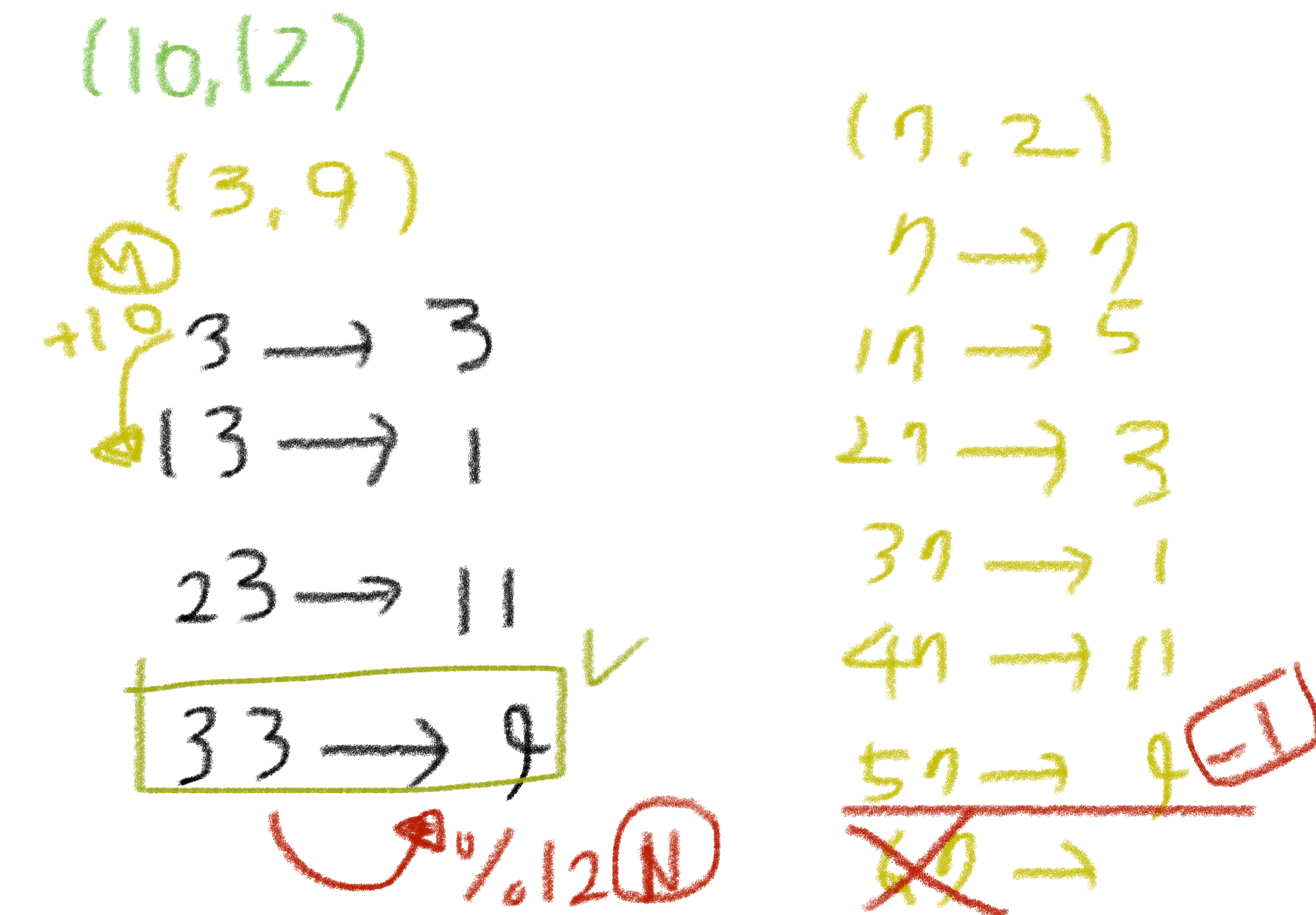 => cnt += M - y 가 될 조건. cnt % N 값이 y 가 되면 ok