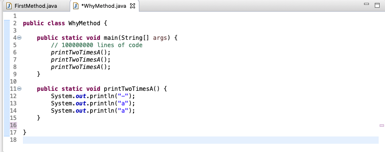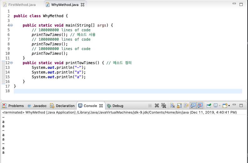 그리고 main()이라고 하는 메소드에서 printTowTimes(); 메소드를 실행하면 해당 부분에 마치 printTowTimes() 메소드의 내용이 마치 여기 있었던 것처럼 그 때 실행시키는 것이다.