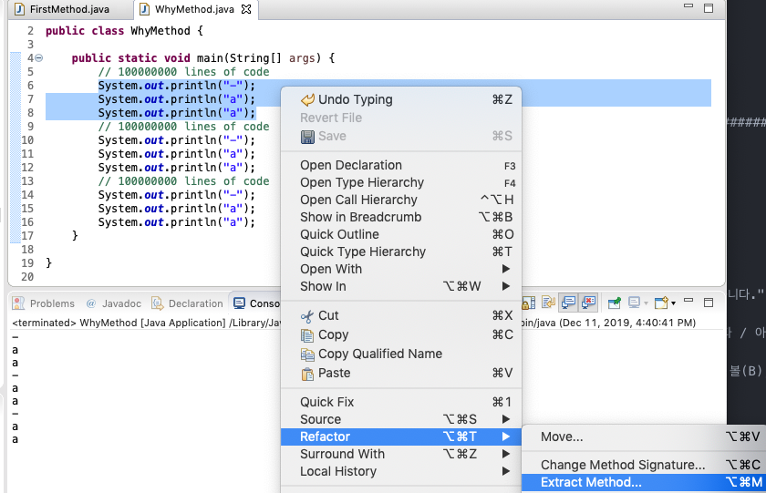 메소드로 만들려는 코드블럭 선택 후, 우클릭 > [Refactor] > [Extract Method]