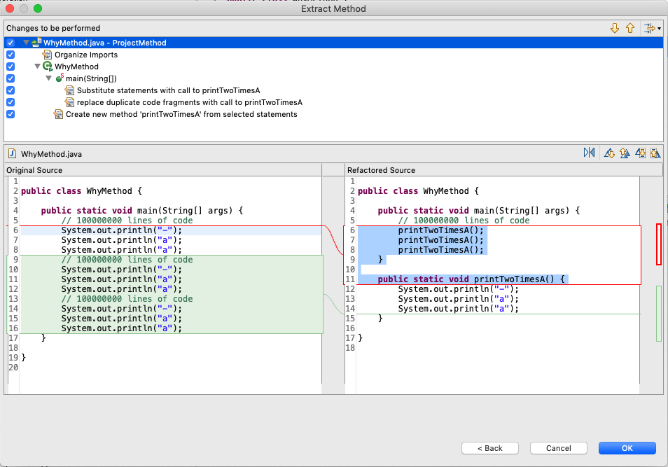 반복된 코드가 1억줄인데 이 코드를 메소드로 만드려고 하면 굉장히 어려운 작업이다. 자바에서는 이러한 작업을 해주는 리팩토링 기능이 존재한다.