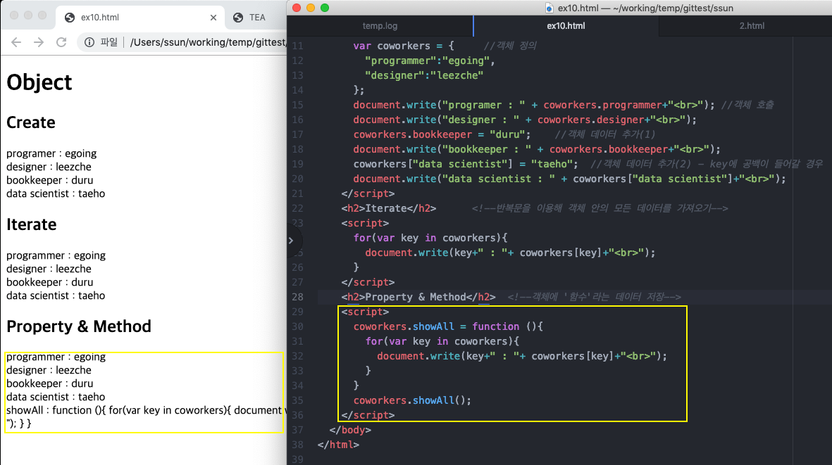 기존에 만들어 놓은 coworkers 라는 객체에 'showAll' 이라는 '메소드'를 추가한다.