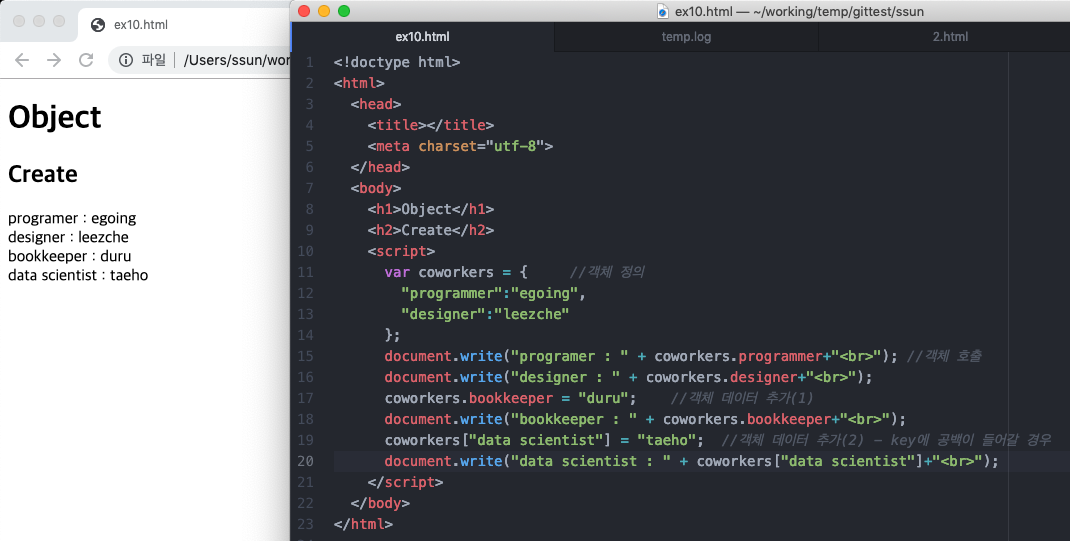 coworkers["data scientist"] = "taeho"; //객체 데이터 추가(2) - key에 공백이 들어갈 경우