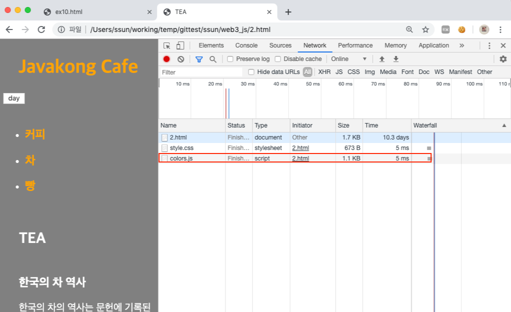 - 코드의 재사용 : 새로운 파일을 만들면 심플하게 colors.js 파일을 새로운 웹페이지에 포함시키면 된다.