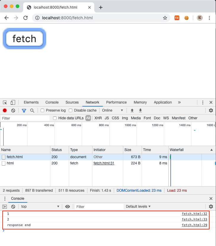 fetch 버튼을 클릭하면 요청이 가고, 서버가 응답한 다음에 callbackme 함수가 실행되면서 console 창에 'response end' 가 출력되는 것을 확인할 수 있다.