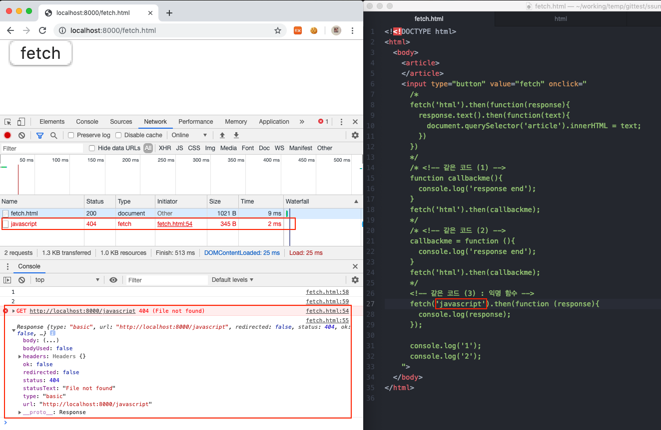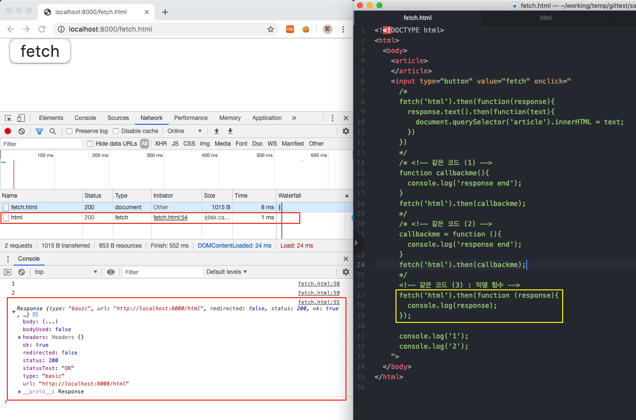 여기서 이 fetch 명령은 끝나고, 아래 코드(콘솔로그에 1, 2 출력)가 실행되다가 웹브라우저가 응답 받는게 끝나면 그때 callbackme 함수를 호출하게 된다.