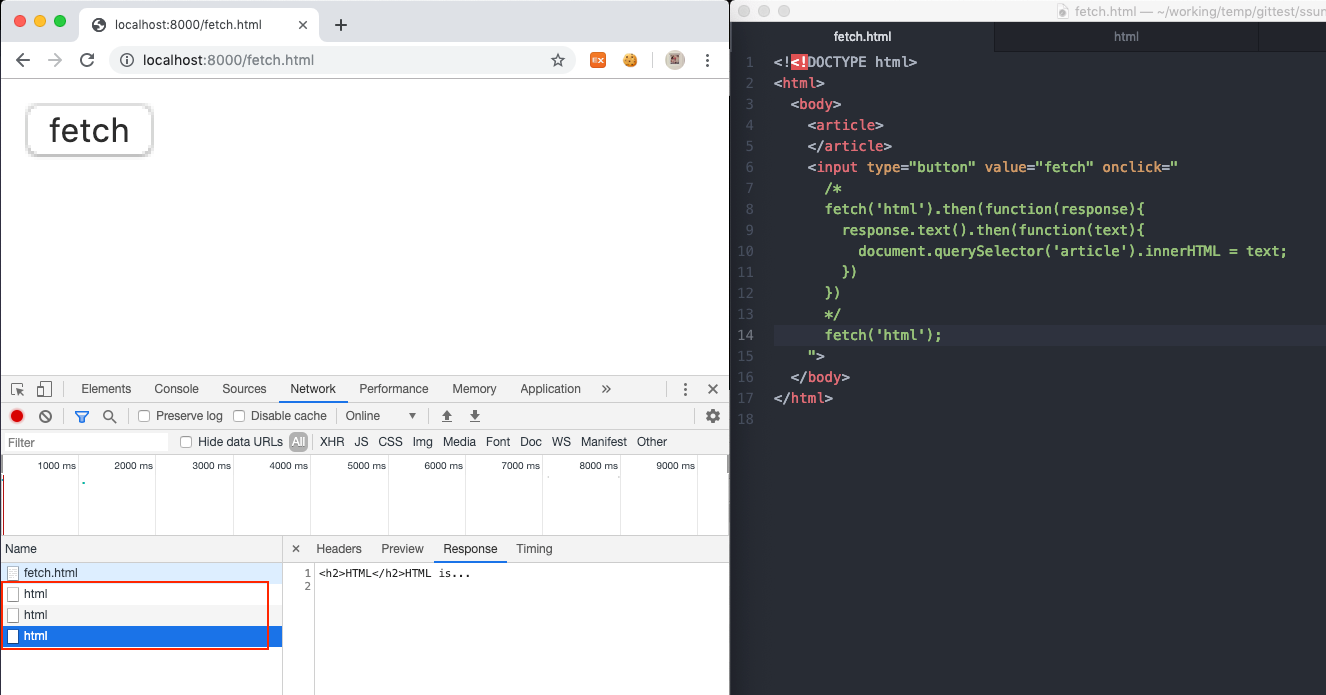 fetch('html') 로 수정하면 되고, response.text().then(function(text){ .... code .....}) code 안에 내용이 실행되도록 약속되어있고, text 값에는 서버가 응답한 내용이 담겨 있다.