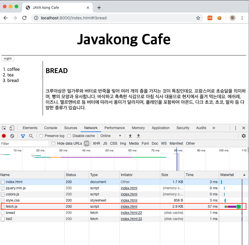 스크립트 추가 후, 웹페이지에서 fetch.js 파일이 잘 로드되는지 확인해야 한다. fetch.js 파일의 status가 200 이므로 잘 로드되었다.