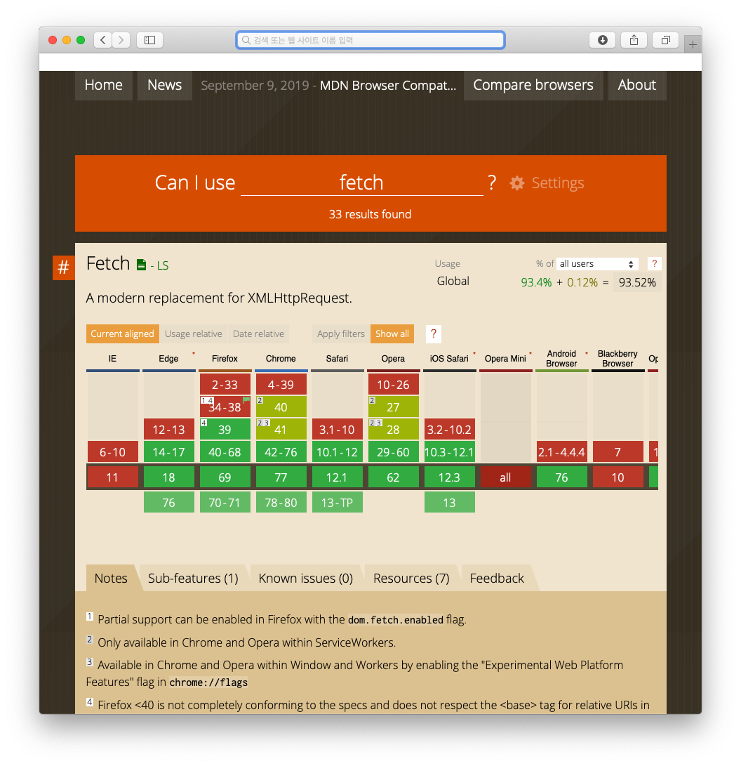크롬으로 웹페이지에 접속하면, fetch.js 파일은 다운만 받아지고 동작하지 않는다. 인터넷 익스플로러(10 버전 이상)와 같이 fetch api 가 지원되지 않는 브라우저에서 페이지에 접속하면, fetch.js가 동작해서 fetch()가 동작하도록 내부적으로 동작한다. "호환성 확보"