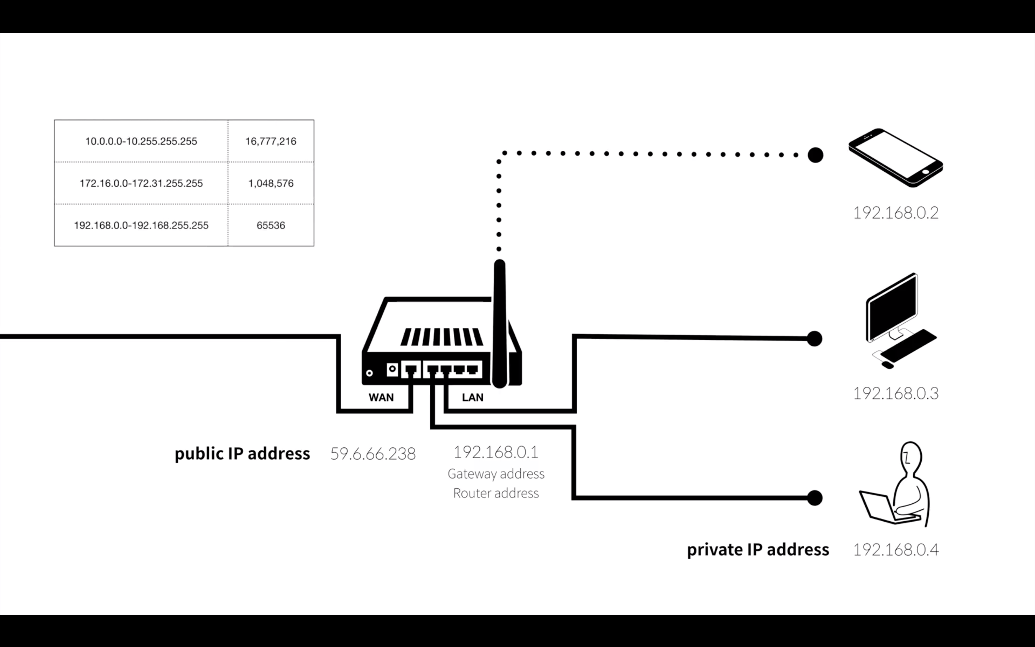 라우터는 광역 네트워크 안에서 공유기로 접속할 수 있게 해주는 ip (여기서는 59.6.66.238)를 가지고 있다. 전세계에에 있느 누구나 접속 가능하다는 뜻에서 'public IP address(공용 아이피)'라고 하고, 안에 있는 기기에 부여된 ip 들은 지역 네트워크 안에서만 쓸 수 있는 ip 주소로 'private IP address(사설아이피)'라고 한다.