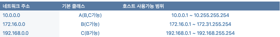 다음 표에서 각 클래스별로 해당 구간은 사설 ip로 쓰기로 전세계적으로 약속해놨다.