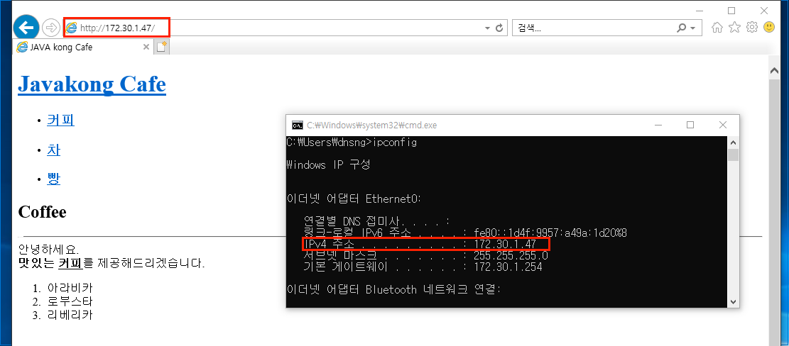 Windows의 IP가 '172.30.1.47'로 변경되고, 로컬 브라우저에서 해당 IP로 웹서버에 접속 가능하다.
