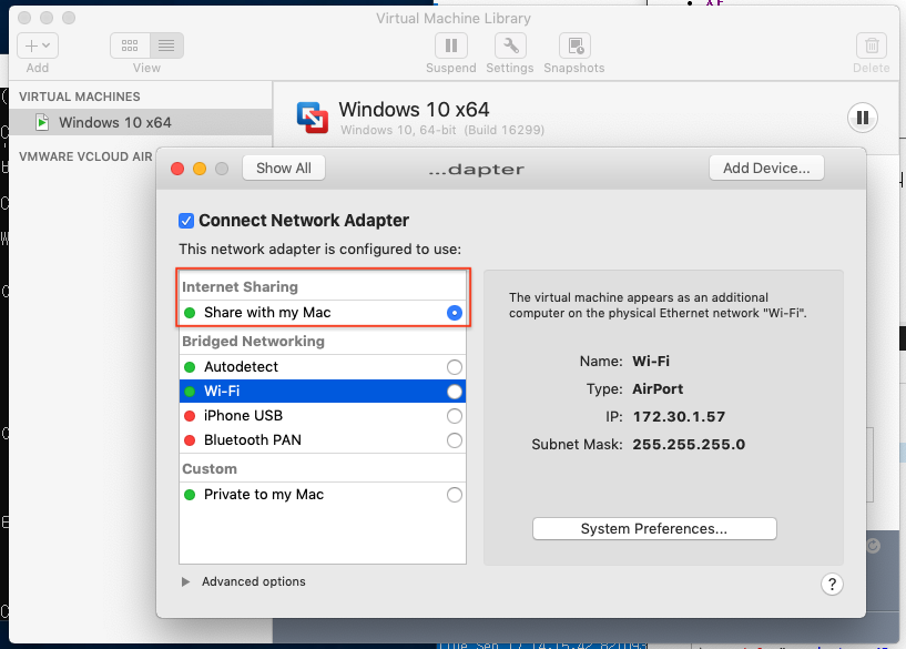VMware의 네트워크 연결 설정을 확인해보면, 현재 'Internet Sharing'으로 선택되어 있다.
