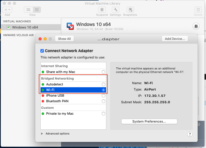 네트워크 연결 설정을 'Bridged Networking'으로 변경