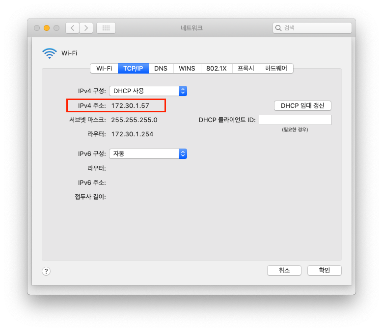 MAC의 IP 주소를 확인해보면 172.30.1.57 이다.