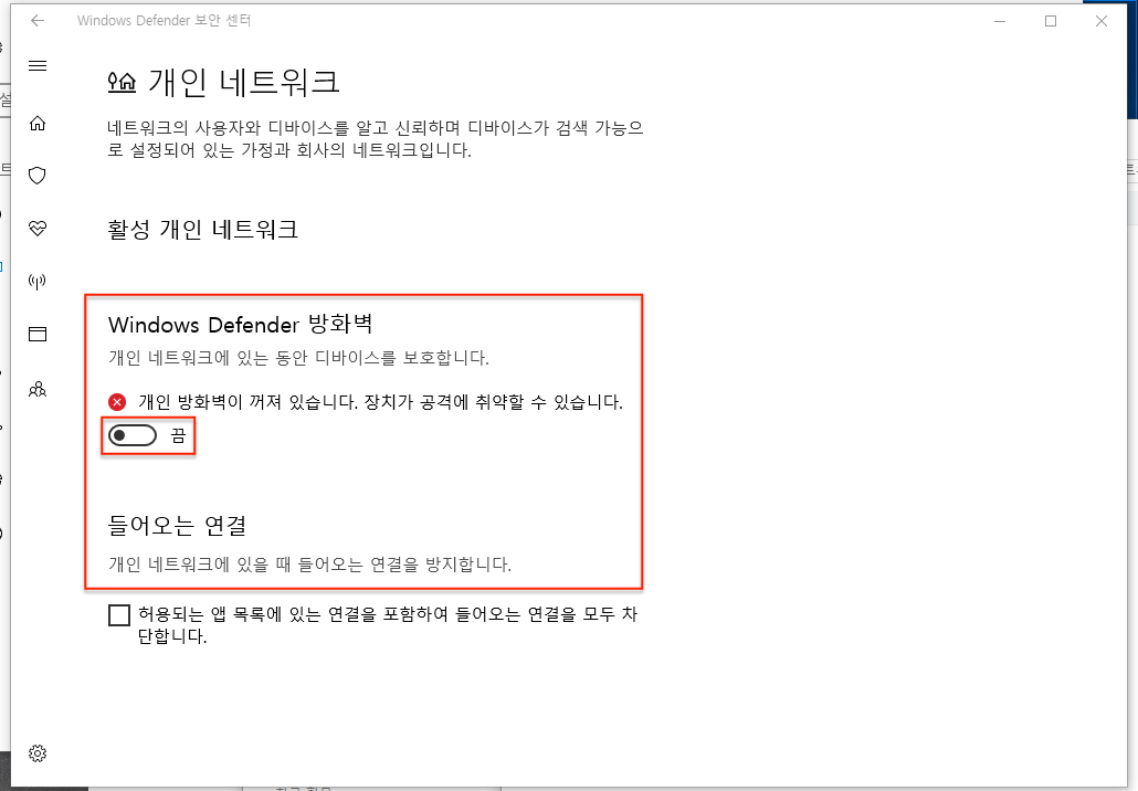 네트워크에 들어오는 연결을 방지하는 방화벽 설정을 해제