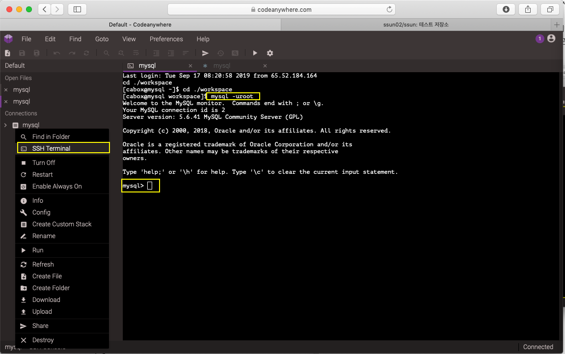 서버가 생성되고, 우클릭 [SSH Terminal]을 열어서 mysql을 실행시킬 수 있다.