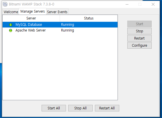 C드라이브>Bitnami 경로에 설치 후, Manager-windows 를 실행시켜서 설치한 서비스를 관리할 수 있음