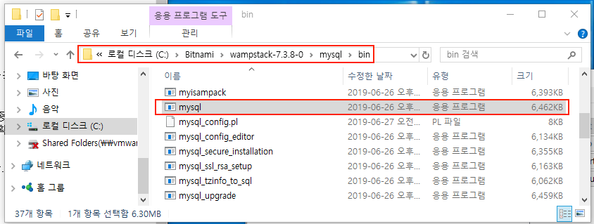 3. mysql 실행파일이 위치한 폴더로 이동해서 mysql 실행