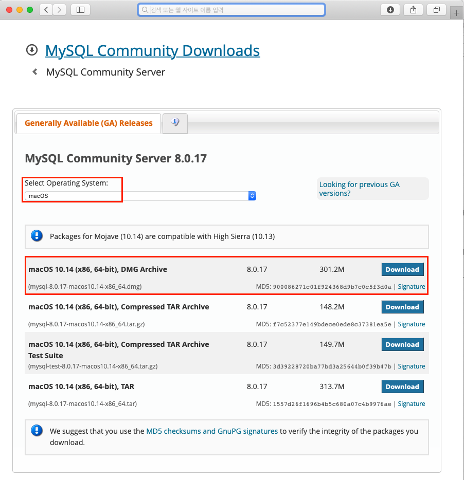[MySQL Community Edition] > [Download MySQL Community Edition] > 'MySQL Community Edition' 클릭 > [Generally Available (GA) Realeases] 운영체제 선택 후, 설치파일 다운로드