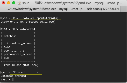 데이터베이스 생성과 사용할 데이터베이스 선택