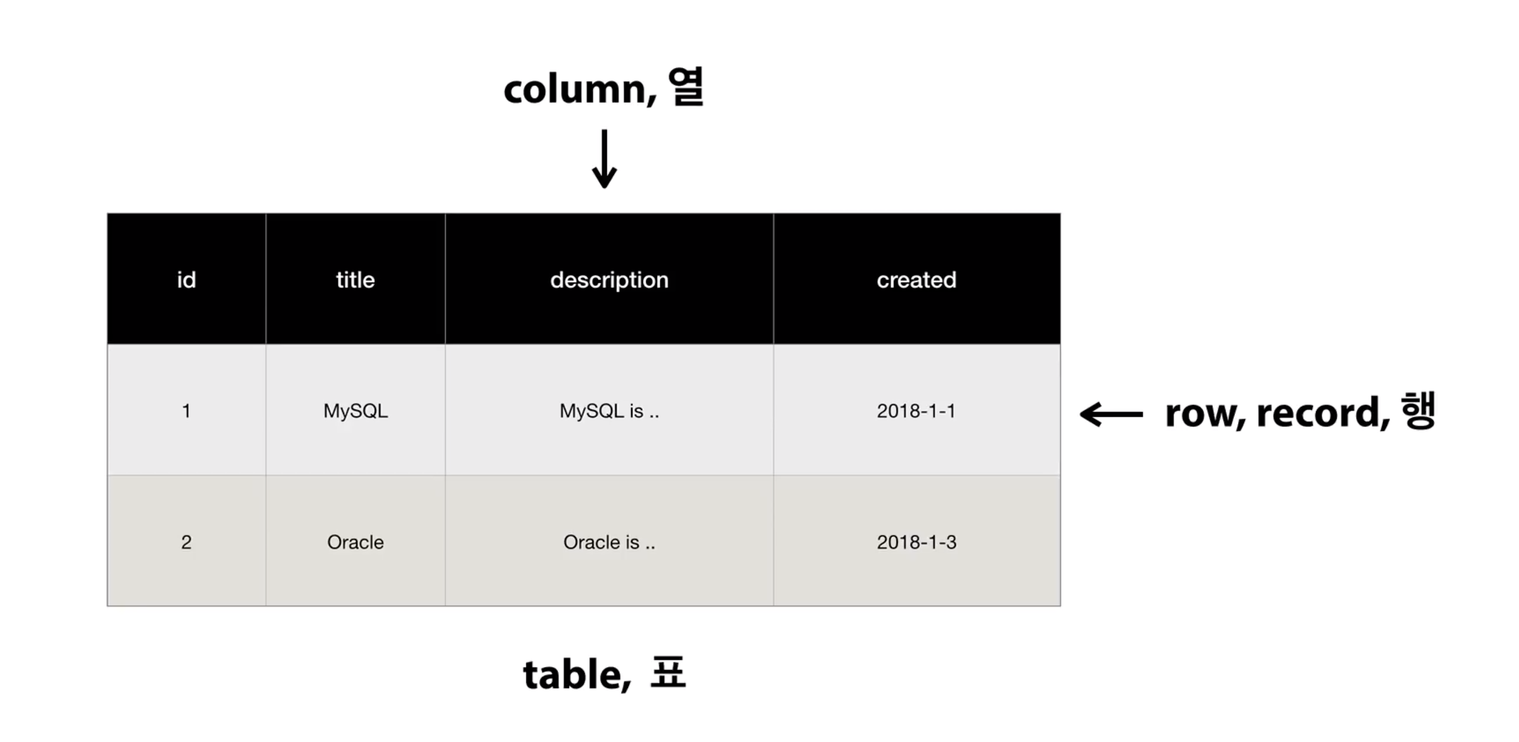 - 표의 x축(행) : row, record / DB에서 record는 데이터 하나하나를 의미