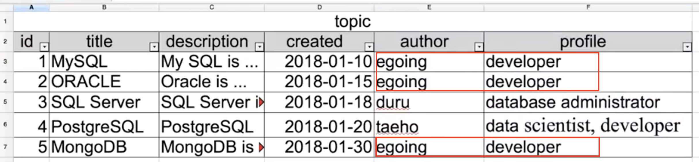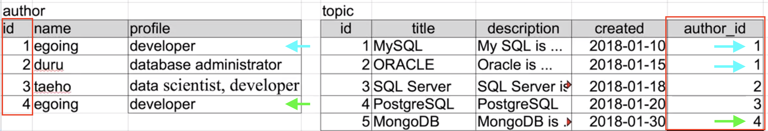 '관계형표'에서는 author의 id 1번과 4번의 이름과 프로필이 동일하지만 다른 사람임을 알 수 있고, topic 테이블에서 1,2번과 5번이 서로 다른 author_id 값을 가지고 있으므로 서로 다른 저자라는 것을 확신할 수 있다.