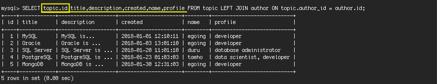 출력되는 id 컬럼이 어느 테이블의 id인지 표시하기 위해 AS로 다른 이름으로 출력